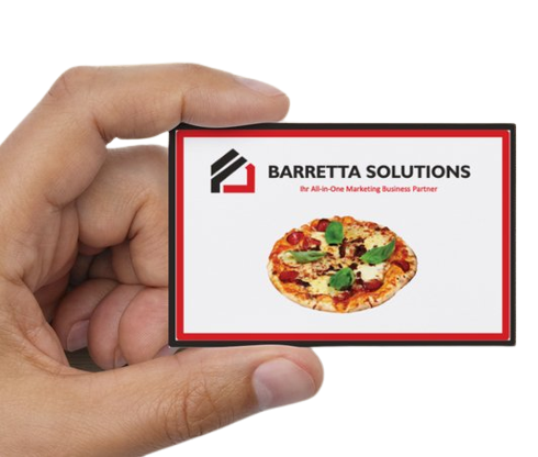 Sie erhalten GRATIS Speisekarten zum Mitnehmen, hochwertige Visitenkarten mit Logo-Prägung und Verpackungen (Pizzakartons oder Tragetüten) mit Ihrem Logo – perfekt für Stammgäste, Laufkundschaft und Ihrem professionellen Auftritt.