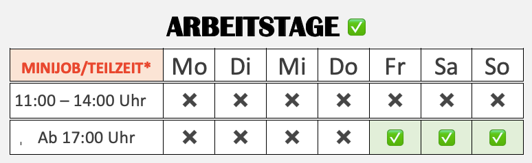 *Keine Pflicht-, sondern gewünschte Arbeitszeiten.